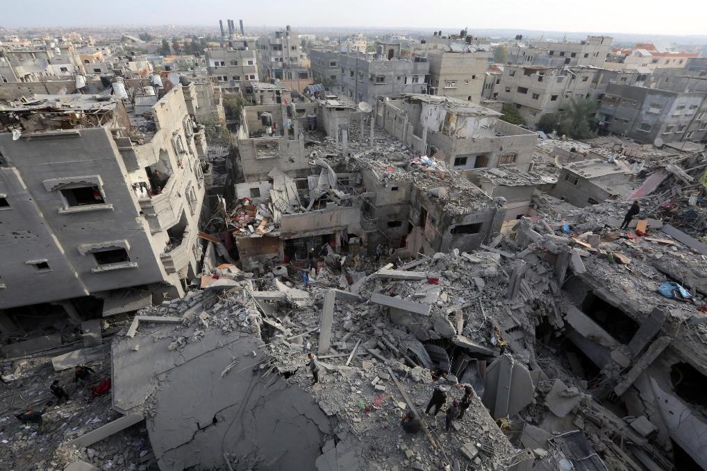 12月16日,在加沙地帶中部努賽賴特難民營,人們查看以軍襲擊后的建筑廢墟。新華社發(fā)(里澤克·阿卜杜勒賈瓦德攝)
