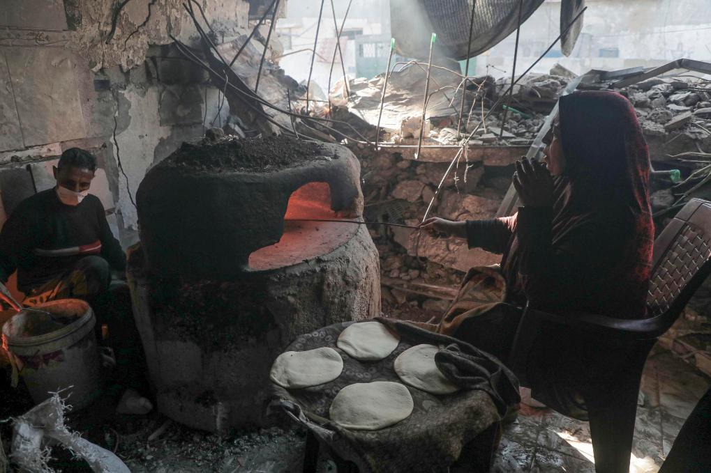 12月15日,在加沙地帶中部城市代爾拜拉赫,巴勒斯坦人在被毀壞的房屋中烤制大餅。新華社發(fā)(里澤克·阿卜杜勒賈瓦德攝)
