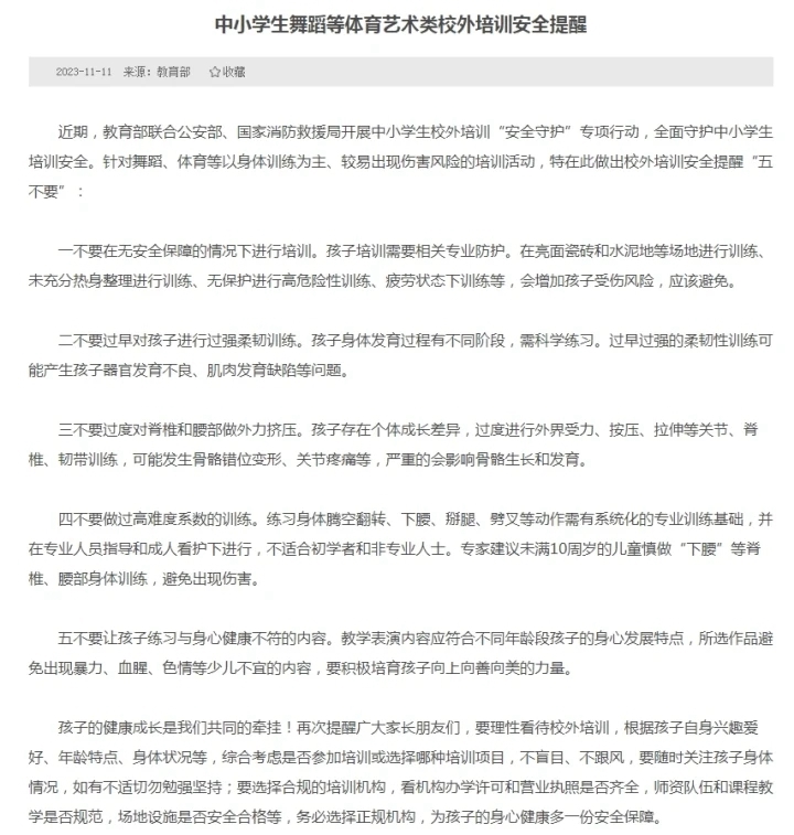 記者11月11日從教育部獲悉,近期,教育部聯(lián)合公安部、國(guó)家消防救援局開展中小學(xué)生校外培訓(xùn)“安全守護(hù)”專項(xiàng)行動(dòng)。針對(duì)舞蹈、體育等以身體訓(xùn)練為主、較易出現(xiàn)傷害風(fēng)險(xiǎn)的培訓(xùn)活動(dòng),提醒不要過(guò)早對(duì)孩子進(jìn)行過(guò)強(qiáng)柔韌訓(xùn)練。
