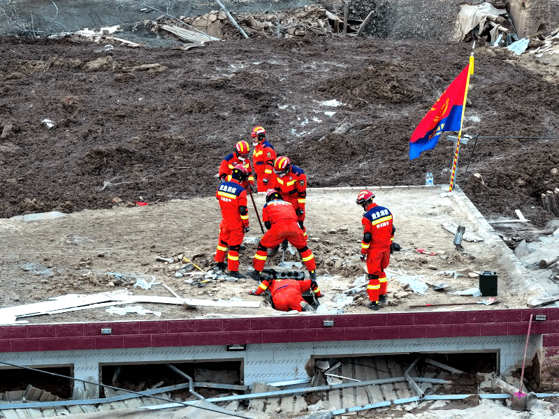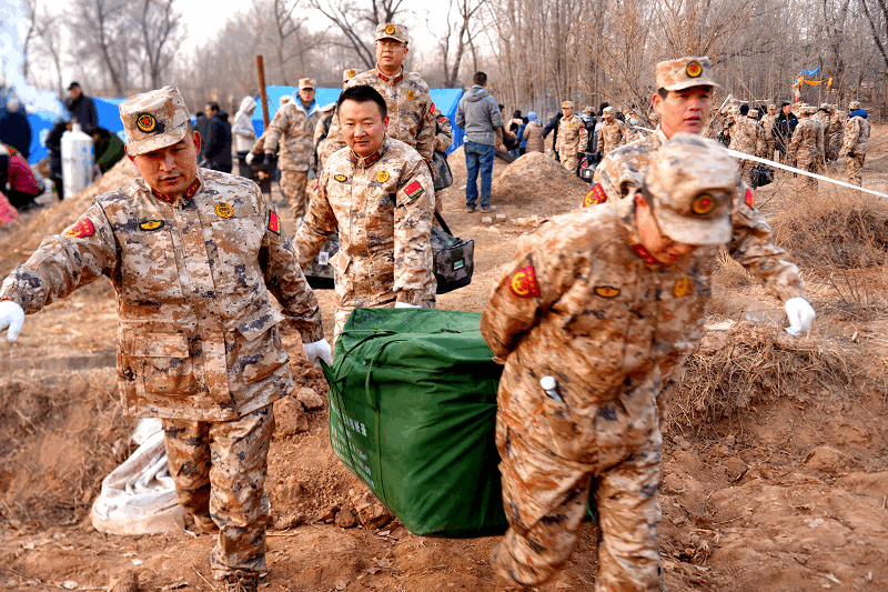 12月19日白天,青海省海東市民和回族土族自治縣正經歷嚴寒。一輛輛消防車從國道拐進中川鄉的村路,載著挖掘機的重卡也駛了進來。再往里走,金田村旁的空地上,現在成了臨時安置點,一排排藍色帳篷分外顯眼,村民們圍著圈蹲在一起,眼神不約而同地往北向瞟去,焦急等待著親友的消息。