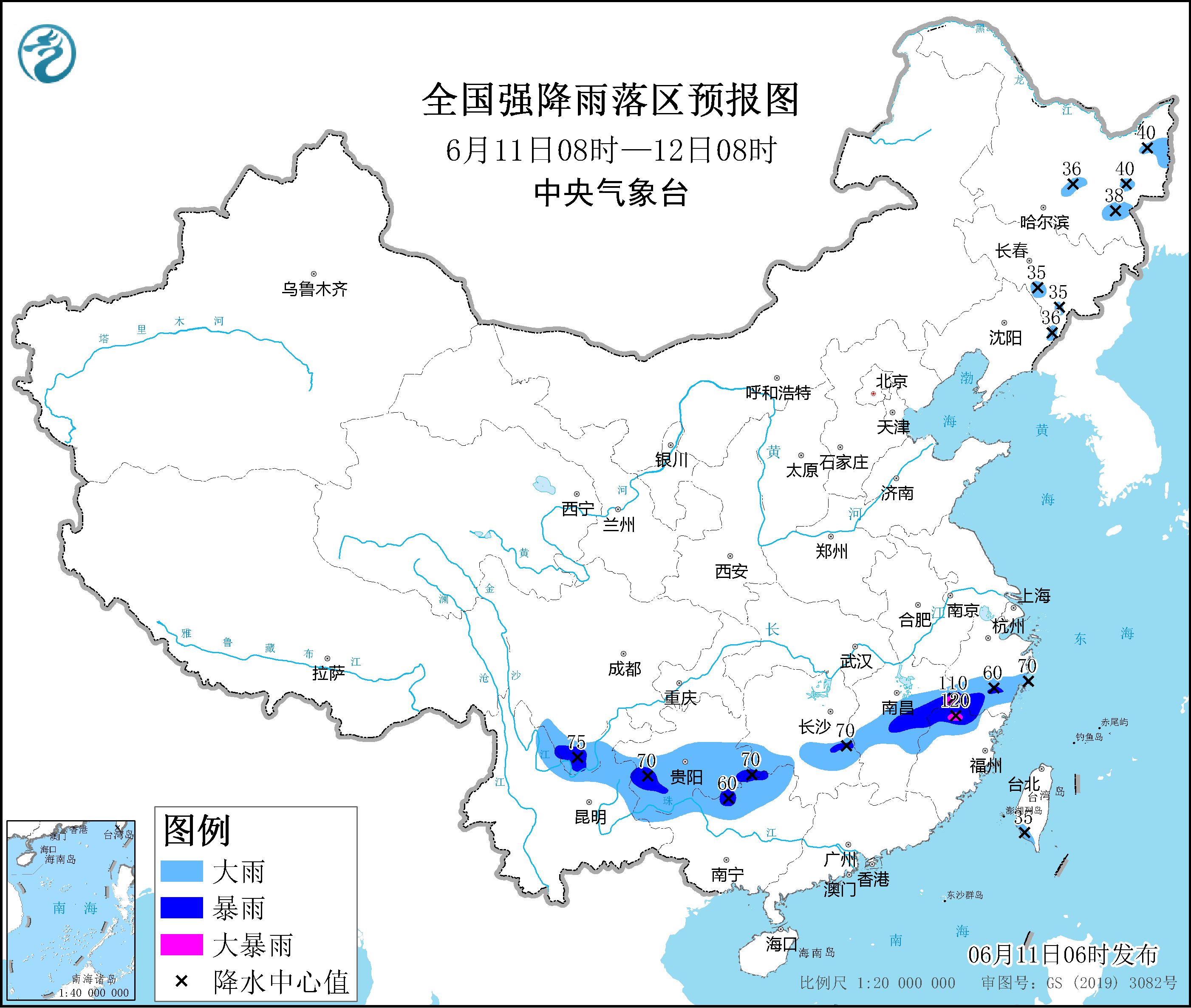 預計,6月11日8時至12日8時,浙江南部、福建北部、江西中北部、湖南南部、廣西北部、貴州中南部、云南東北部、四川南部,以及東北地區東部、臺灣島西南部等地部分地區有大到暴雨,其中,江西東北部、浙江西南部、福建西北部等地局地有大暴雨(100~120毫米)。上述部分地區伴有短時強降水(最大小時降雨量30~50毫米,局地可超過70毫米),局地有雷暴大風等強對流天氣。