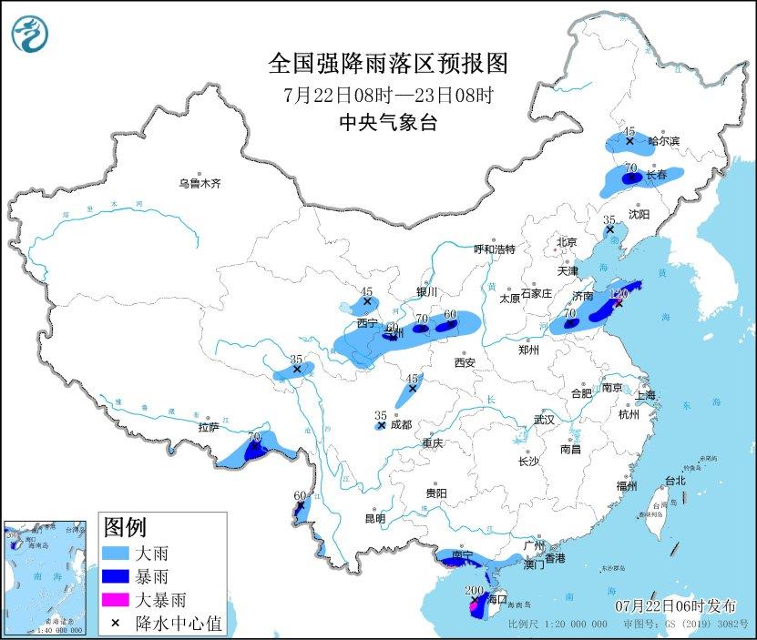 預計,7月22日08時至23日08時,海南島、廣東西南部、廣西南部、云南西部、四川盆地西部、西藏東南部以及青海東部、甘肅南部、寧夏南部、陜西中部、山東、內蒙古東南部、吉林中西部等地有大到暴雨,其中,海南島西部、廣西南部沿海地區、山東半島南部等地的部分地區有大暴雨(100~200毫米)。上述部分地區伴有短時強降水(最大小時降雨量30~50毫米,局地可超過80毫米),局地有雷暴大風等強對流天氣。