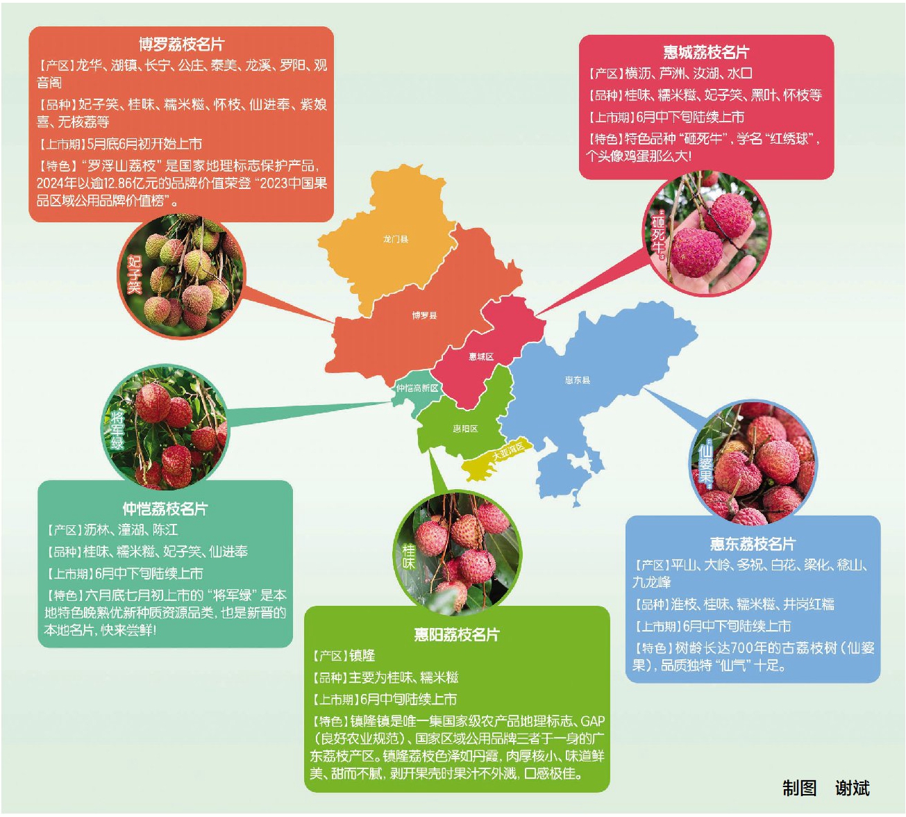 “惠州很多縣區都有種植荔枝,現在正是荔枝上市季節。萬能的惠民通,請問惠州各縣區都有哪些荔枝?有什么特色?能不能出個荔枝地圖?”