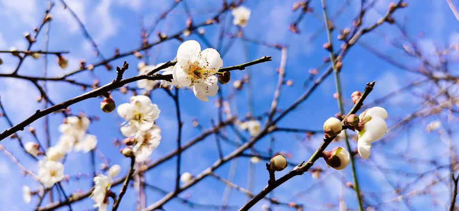雖然第一批的梅花不算多,但靚麗的白色已經藏不住了。漫步梅花山,盡管梅花只是星星點點,但是枝頭飄白,盡顯清冷高雅。另外,許多梅花含苞待放,點點雪白爬上枝頭,為冬日帶來一抹特有的幽香。