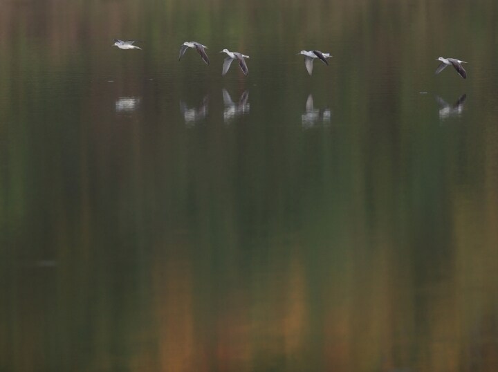 成群的長腳反嘴鷸飛過水面蔚為壯觀。