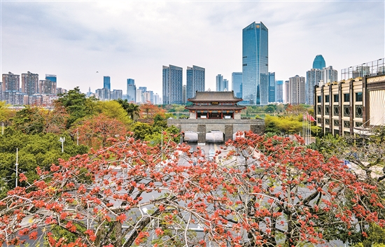 “最近聽說這邊的木棉開了,恰好出來活動(dòng)活動(dòng)。”住在附近的李奶奶說,趁著上午天氣好,就拉著老伴出來散步賞花,順便撿一些木棉花回去曬干煲湯。望著枝頭上的木棉花,在藍(lán)天白云的托襯下,似乎更加火紅,更加鮮艷。紅艷艷的木棉花為城市增添了濃濃的生機(jī)。