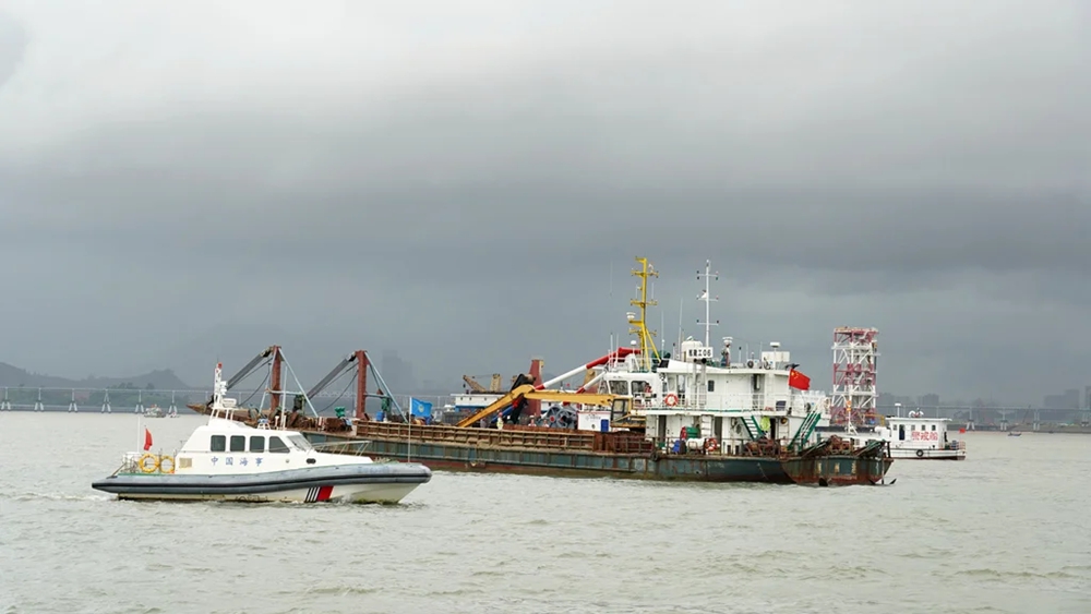 在大亞灣中海殼牌三期填海施工項目對開水域,惠州舉行首次船舶防臺風(fēng)應(yīng)急演練。
