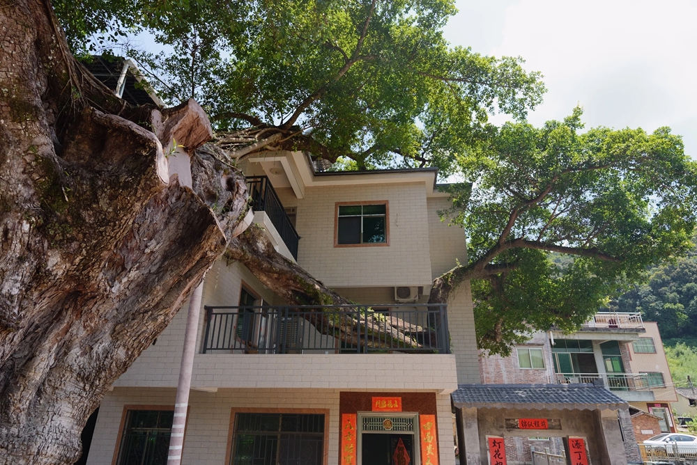 原來,村民張先生家的宅基地就在這棵榕樹邊,2019年重建新房時為了不影響古樹,對房子進(jìn)行了專門設(shè)計(jì),不惜“缺一個角”,少一個房間,只為了給千年古樹生長騰挪位置。