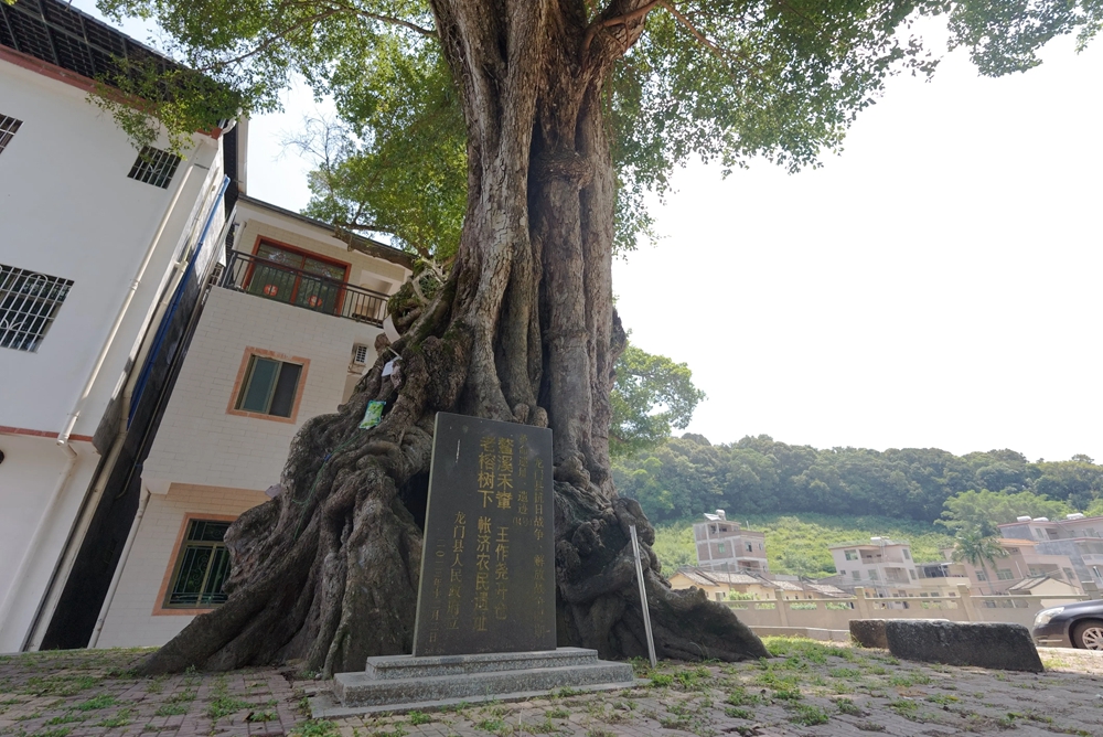 關(guān)于這棵榕樹,還有一個故事。故事被刻在樹下的一塊石碑上,上寫著“鰲溪禾輋,老榕樹下——王作堯開倉帳濟(jì)農(nóng)民遺址”,講的就是當(dāng)年東江縱隊(duì)副司令員王作堯率領(lǐng)部隊(duì)挺進(jìn)麻榨鰲溪地區(qū),在老榕樹下攻破敵人糧倉,接濟(jì)農(nóng)民的歷史故事。