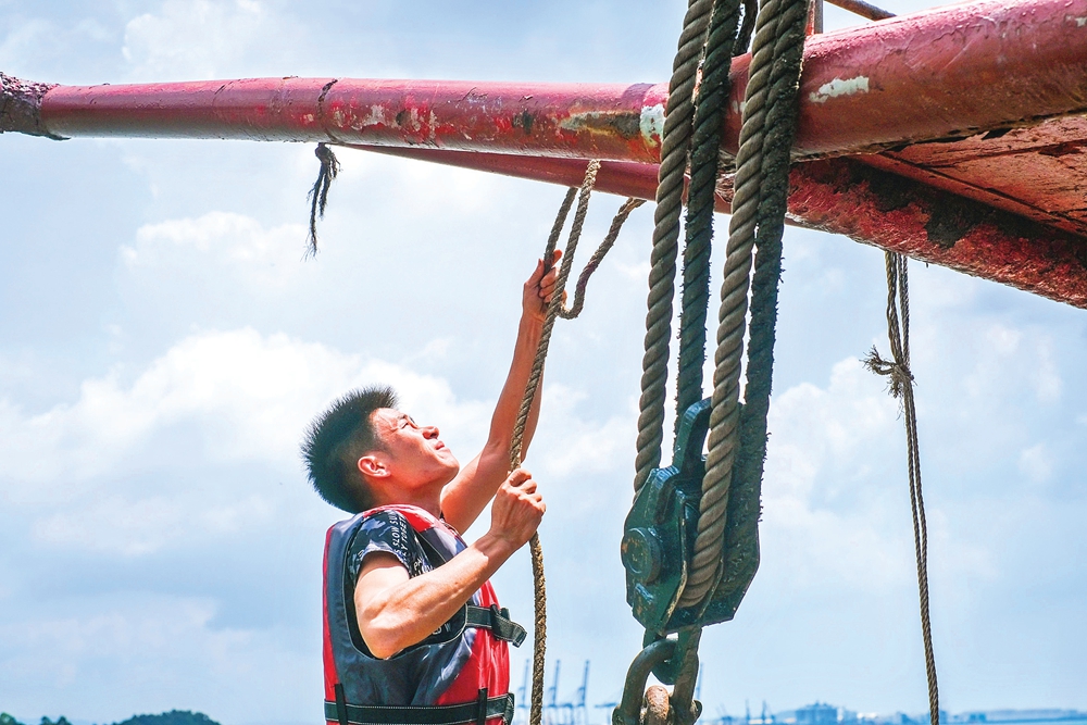 開漁前,漁民在漁船上整理漁網(wǎng)。