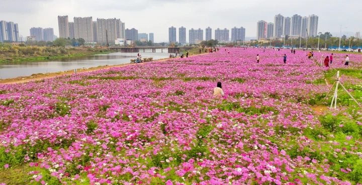 3月18日,在惠州市惠城區小金河大道路邊上有30畝格桑花盛開,吸引蝴蝶和蜜蜂前來分享。有白色、粉色、紫紅色等一朵朵格桑花迎著天空綻放,形成了一片花海,吸引許多游客觀賞打卡。