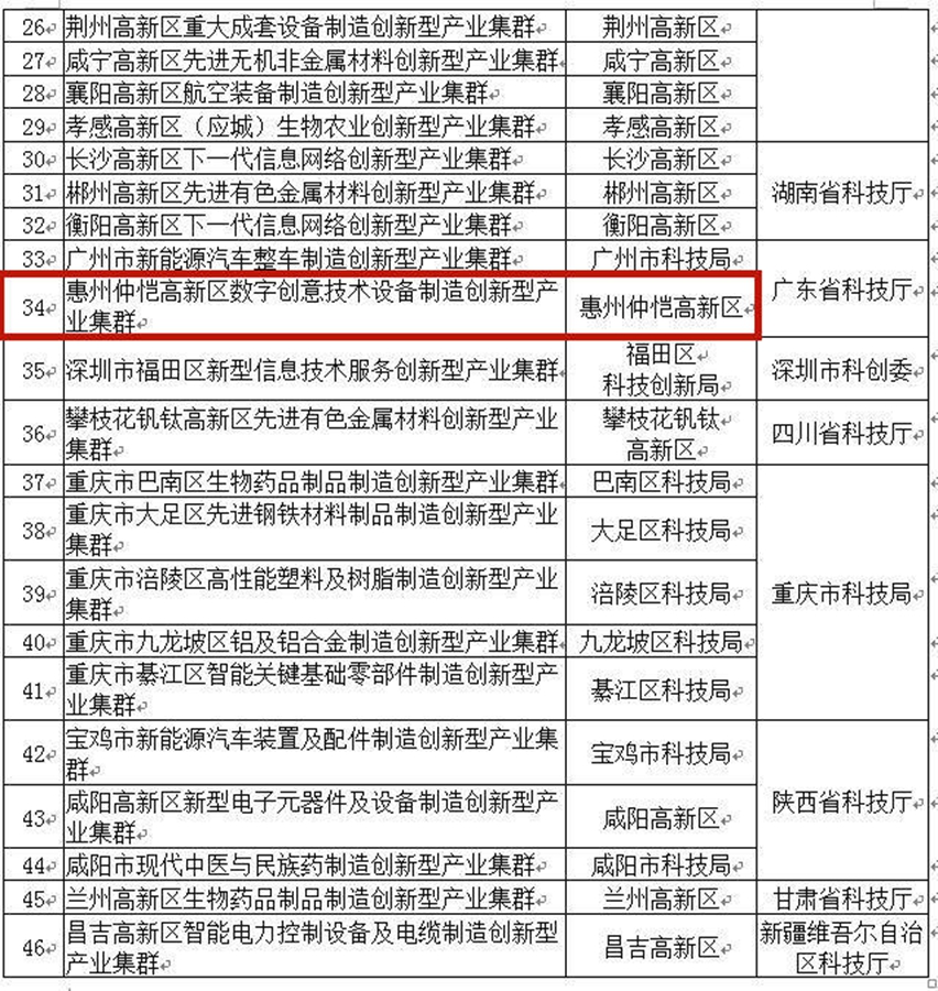 日前,科技部火炬中心公布新一批創新型產業集群名單,全國共46家創新型產業集群榜上有名。其中,惠州仲愷高新區數字創意技術設備制造創新型產業集群入選,成為全市唯一一家上榜的產業集群。