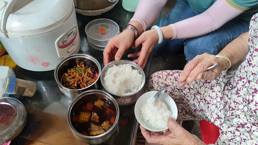 中午11時許,送餐志愿者劉麗敏剛把飯放下來,就發現93歲的徐奶奶滿身大汗,于是幫她換衣服,打開風扇,然后擰開不銹鋼飯盒蓋,把湯盛到碗里。