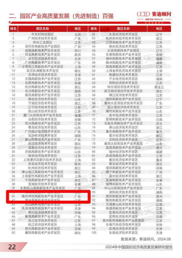 8月15日,研究機構賽迪顧問全文發布《2024年中國園區經濟高質量發展研究報告》(下稱《報告》),公布“園區高質量發展百強(2024)”榜單。其中,仲愷高新區上榜,成為惠州唯一入選的園區。