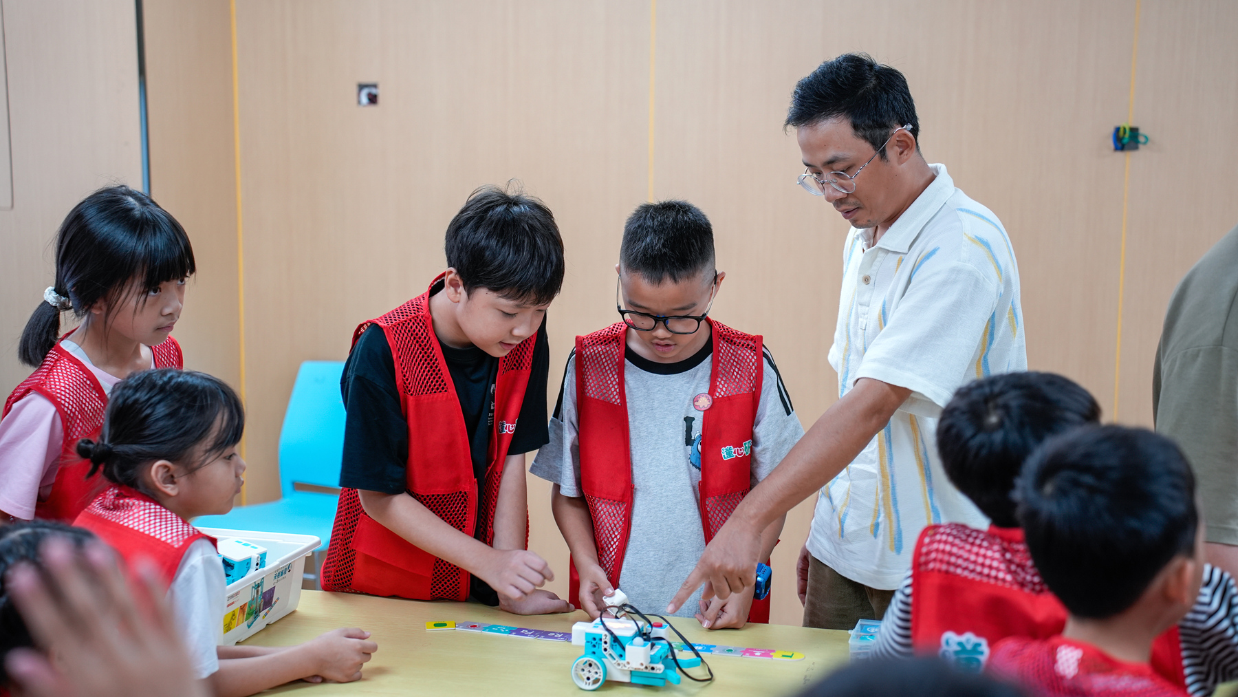 剛到達活動營地——中韓(惠州)產業園起步區黨群服務中心,孩子們就走進了機器人的知識世界。在這里,他們從了解機器人的驅動、感知、控制系統到認識手臂、電動機、傳感器等零部件,以及在醫療、工業、運輸等多個領域的神奇應用,心中的好奇被瞬間點燃。通過趣味實踐,孩子們親眼見證這些“法寶”如何讓機器人擁有“看”和“聽”的能力,原本抽象的科學原理瞬間變得生動易懂。