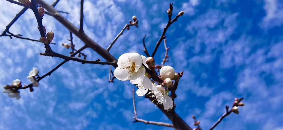 雖然第一批的梅花不算多,但靚麗的白色已經藏不住了。漫步梅花山,盡管梅花只是星星點點,但是枝頭飄白,盡顯清冷高雅。另外,許多梅花含苞待放,點點雪白爬上枝頭,為冬日帶來一抹特有的幽香。