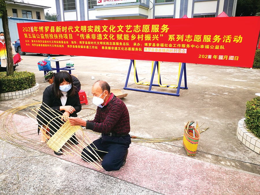 1月4日,泰美鎮新時代文明實踐所、鎮非遺工作站聯合博羅縣幸福社會工作服務中心幸福公益隊、赤嶺村新時代文明實踐站,在該鎮赤嶺村委會廣場開展“傳承非遺文化 賦能鄉村振興”系列志愿服務活動(第一期)。本期活動以“手工竹編一起學”為主題,由泰美鎮傳統手工竹編手藝人聶太勝為赤嶺村村民帶來手工竹編傳統手藝,讓大家近距離學習和感受這一非遺文化。