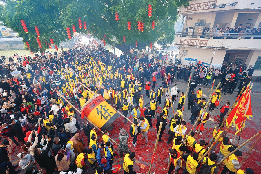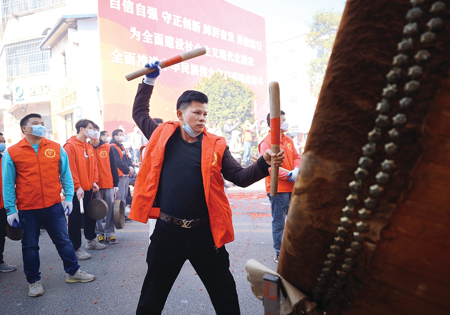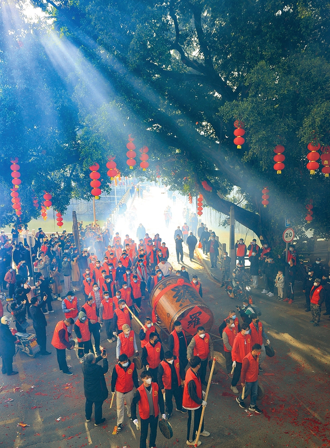 “咚,咚咚,咚咚咚……”1月29日,農歷正月初八,時值博羅縣橫河鎮大部分村莊的“上燈”之日,傳承500余年的橫河大鼓也如約在圩鎮擂響。聲遏云霄的鼓聲,承載了鄉親們對國泰民安的美好祈愿,也成為當地村民團結和睦的真實寫照。