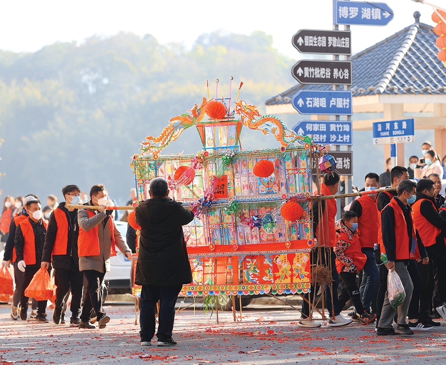 接燈隊伍抬著花燈經過橫河圩鎮。