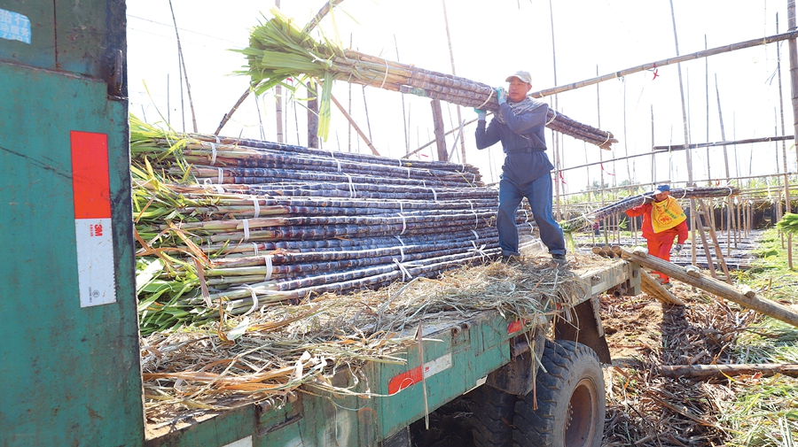 工人把甘蔗搬運裝車。 惠州日報記者鐘暢新 攝