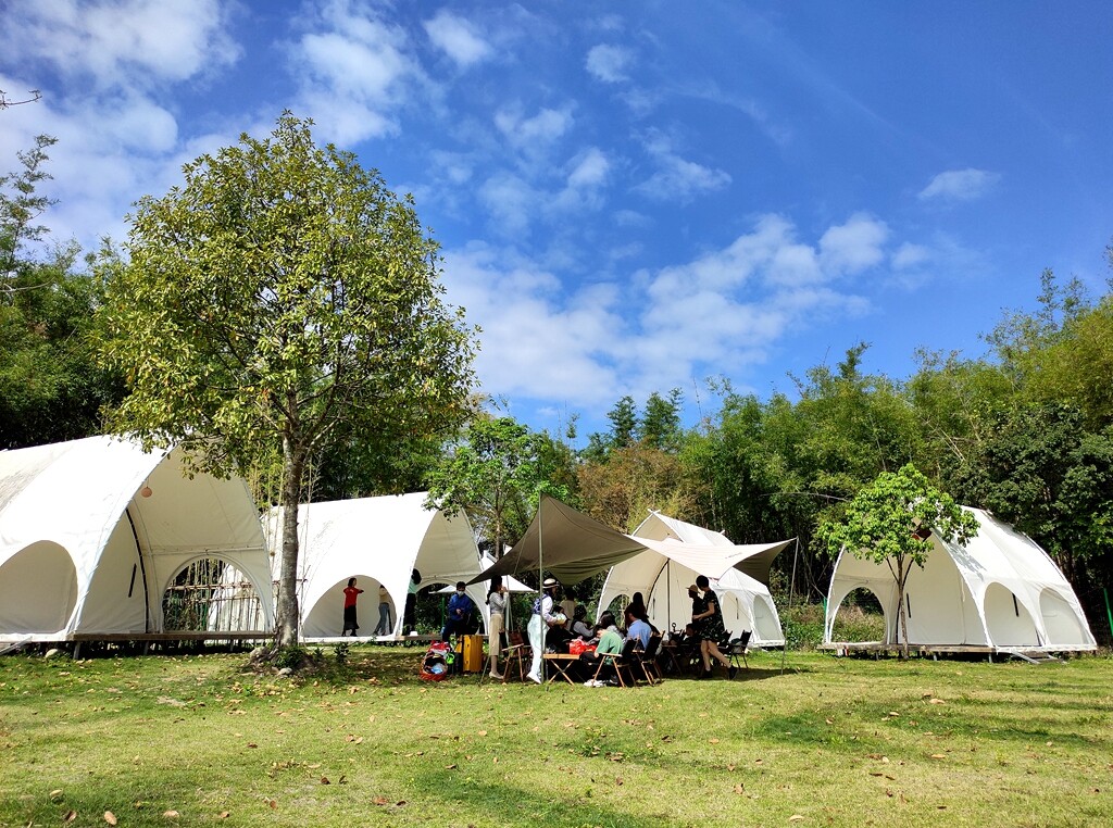 “羅浮山下的鄉村旅游近年蓬勃發展,游客絡繹不絕,鄉村經濟活躍。”前些年,黃興華在家鄉建設農莊,供自己和親友休閑度假。眼見著涌入村里的游客越來越多,2020年9月,黃興華決定從深圳回到村里創業,為鄉村建設貢獻力量。懷揣著盤活農村閑置資產、農旅融合發展的方案,黃興華找到下浪村村干部,雙方一拍即合。黃興華注資成立的塱里稻香農耕體驗旅游(惠州市)有限公司,與下浪村委會簽訂村企合作項目協議,共同經營浮生六季生態園。在各方努力下,生態園一期項目在2021年春節開門試業。