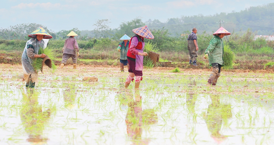 楊村鎮石灘村的水田里一片忙碌景象。 惠州日報記者鐘暢新 攝