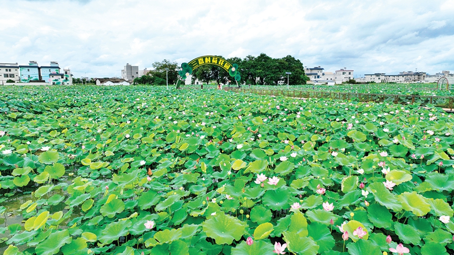 三嘉村的荷田超百畝,碧綠的荷葉大如玉盤,盤盤相接,似乎一直連到遠山的接天處;一朵朵盛開的荷花,有的艷紅,有的潔白,裝點著碧綠的荷田,天然的水墨寫意畫就此渾然天成,“接天蓮葉無窮碧,映日荷花別樣紅”的美景在此復(fù)制。