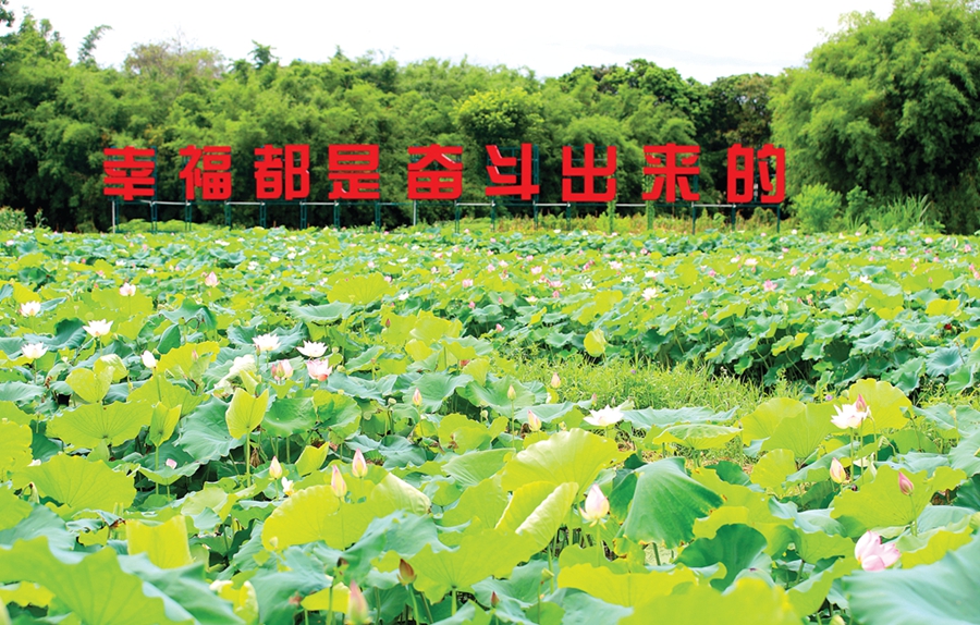 荷田處有一條別致的賞荷棧道。沿著棧道穿行,置身荷田花叢中,美得讓人陶醉。