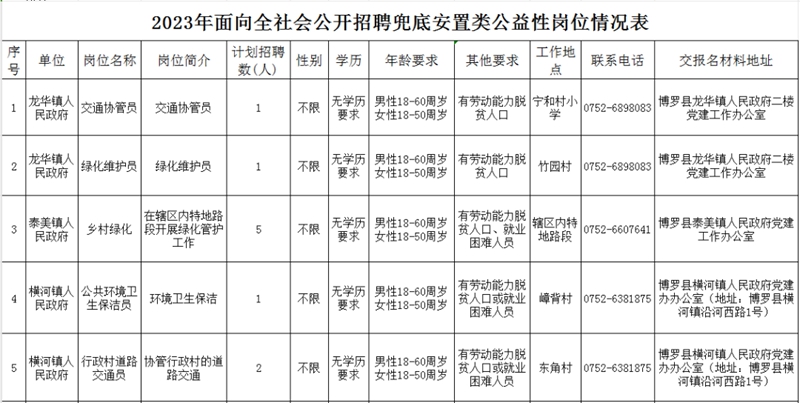 為加強鄉村公共就業服務隊伍建設,夯實鄉村振興人才支撐,大力推動兜底安置類公益性崗位(含鄉村公益性崗位)開發,根據《廣東省人力資源和社會保障廳 廣東省財政廳關于修訂印發<廣東省兜底安置類公益性崗位開發管理辦法>的通知》(粵人社規〔2020〕13號)和市人社局《關于做好惠州市2023年兜底安置類公益性崗位開發工作的通知》(惠市人社函〔2023〕144號)文件要求,結合博羅縣工作實際,現將公益性崗位公開招聘有關事項公告如下: