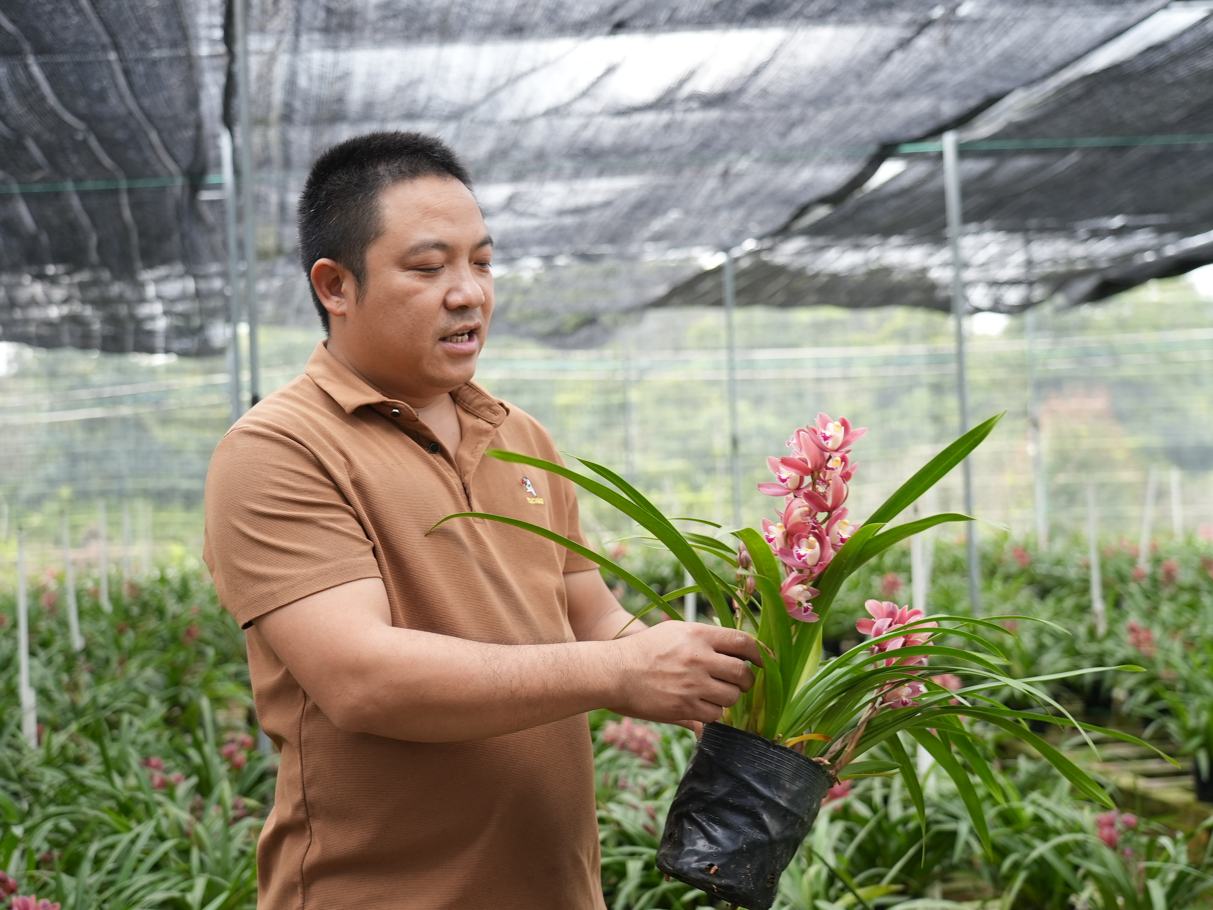 采訪期間,該蘭花合作社的負責人鄧榮生一直在忙碌著。剛帶采購商看完蘭花樣品,又開始組織工人搬蘭花出貨了。