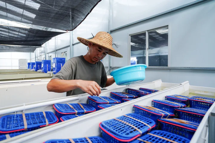 種蝦養殖廠房內,飼養員正往小籃子里投喂養料。