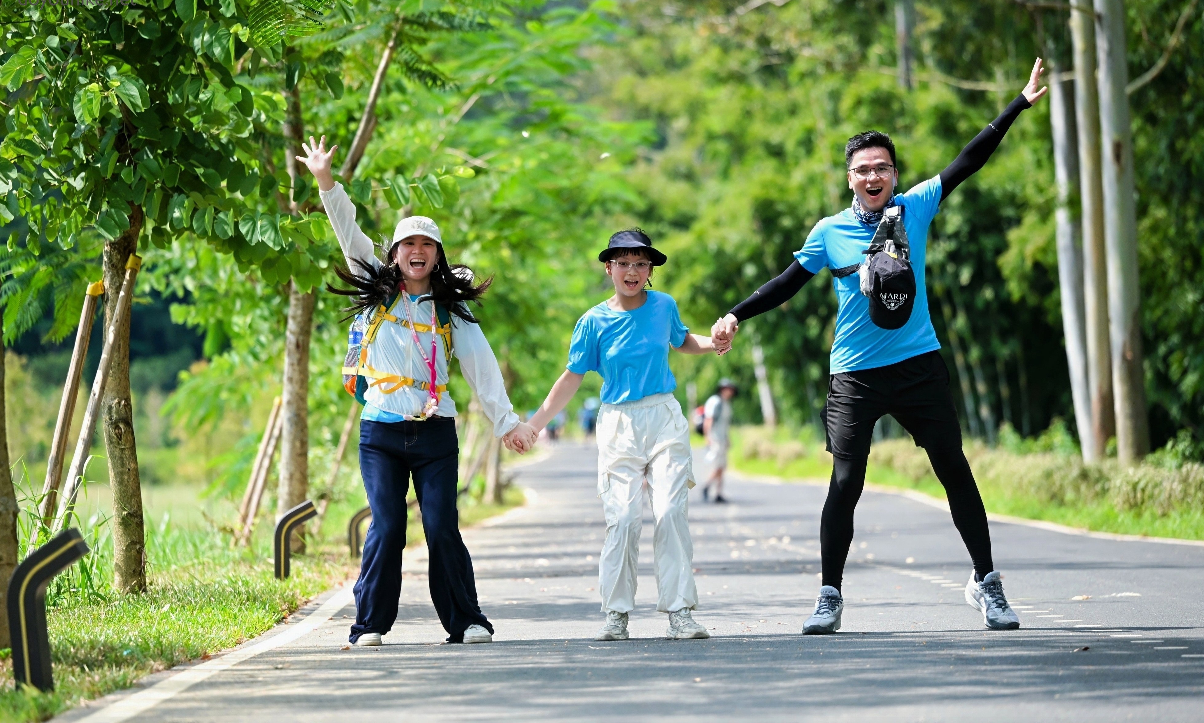 本次活動依托218最美旅游公路的交通與景觀優勢,以羅浮山力天夢幻樂園星光廣場為起點,途經風袂驛、顯崗水庫驛站等地,最終抵達上良村,全程12.7公里,參與者沉浸式體驗“人在畫中游”的詩意旅程。“218最美旅游公路風景特別美,之前自駕過,這次徒步慢慢走,更能感受山水的秀美,沿途的驛站也建得很漂亮。”人群中,葉女士一家格外引人注目——三姐妹帶著6個孩子組成了“親子徒步團”,對于沿途的風景,她贊不絕口。