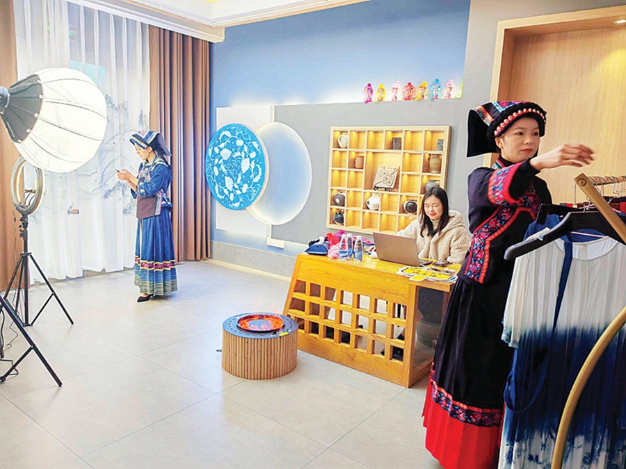 阿妹戚托小鎮是全國唯一的易地扶貧整鄉搬遷特色小鎮,也是國家4A級旅游景區。在富有民族特色的小鎮臨街一排樓房,黨群“山海同心”圓夢空間的牌子格外醒目。記者現場看到,黨群“山海同心”圓夢空間分為門面相向的A、B兩區。走進圓夢空間,一股清新而溫馨的感覺撲面而來,各個功能區劃分自然而緊湊。A區主要設置了黨群“山海同心”工程宣傳推廣、夢想點亮、學習培訓交流、支教助學等服務功能;B區主要功能為青年創業扶持、非物質文化遺產傳習和直播帶貨平臺。在一個設備齊全、光線明亮的直播間里,全國人大代表、貴州布依垚文化發展有限責任公司董事長李利正和她的團隊進行直播帶貨。