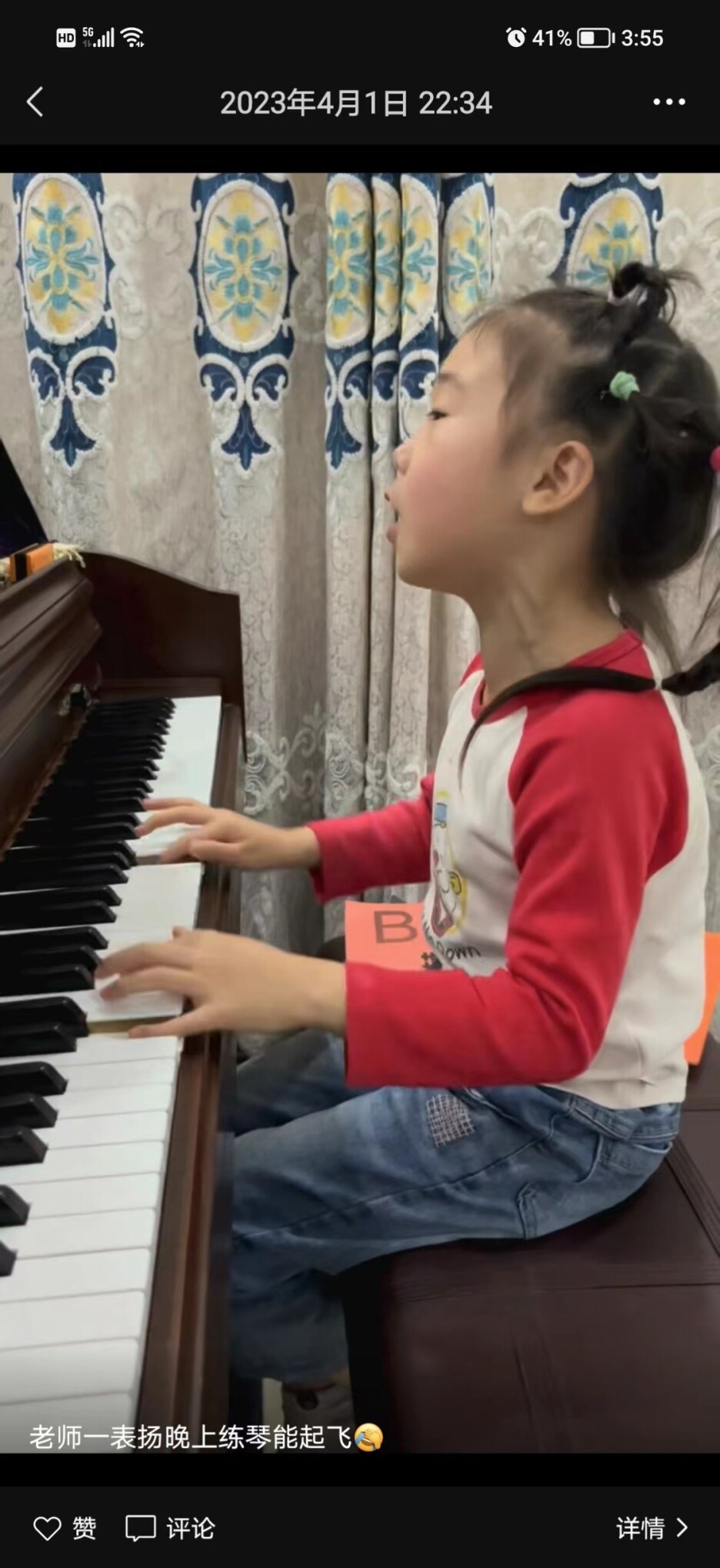 王女士說,4月1日晚上10點(diǎn)半,她看時(shí)間比較晚了,就囑咐云朵彈完最后一遍《我們的祖國(guó)是花園》趕緊睡覺,彈的時(shí)候她就用手機(jī)錄了下來!拔腋f‘哇哈哈’沒有這么快的,她說‘哇哈哈’就是這么歡快的,她對(duì)歌曲有自己的理解!蓖跖空f,當(dāng)時(shí)她在朋友圈也發(fā)了,還配了一段文字“老師一表揚(yáng),晚上練琴能飛起”,說的就是當(dāng)時(shí)云朵一邊彈琴一邊唱的激情狀態(tài)。