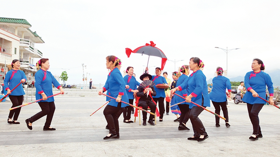 東升村是一個四面環(huán)海的海島漁村,擁有豐厚的漁家傳統(tǒng)文化,其漁家婚嫁習(xí)俗是廣東省非物質(zhì)文化遺產(chǎn)保護項目,一年一度的大王爺節(jié)是市級非物質(zhì)文化遺產(chǎn)項目。近年來,東升村黨支部積極打造東升村特色文化站,組建“東升漁歌歌舞隊”,啟動“東升漁女”漁家文化傳承及創(chuàng)收賦能提升項目,將漁家歌舞表演搬到了網(wǎng)絡(luò)直播間,掀起了一股弘揚東升漁家文化的熱潮。東升漁家文化在傳承與創(chuàng)新中煥發(fā)新活力。