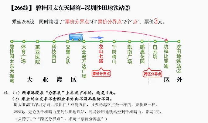 266線的“跨區分界點”在大亞灣【鵬惠花園】站與惠陽【白云坑】站之間;“票價分界點”設在【龍山七路】站。