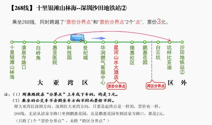 268線的“跨區分界點”在大亞灣【鵬惠花園】站與惠陽【白云坑】站之間;“票價分界點”設在【星河山水大酒店】站。