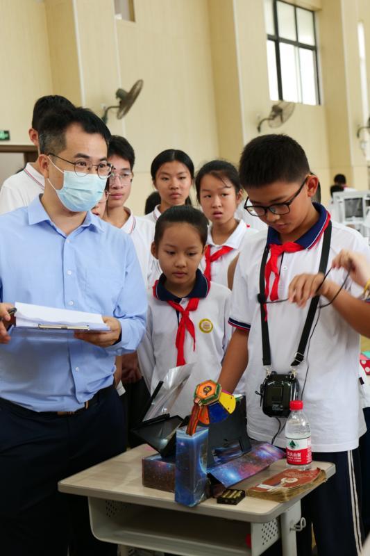 “小科學家”向評委們展示自己的作品。 惠州日報記者張宇琪 通訊員杜雯 攝