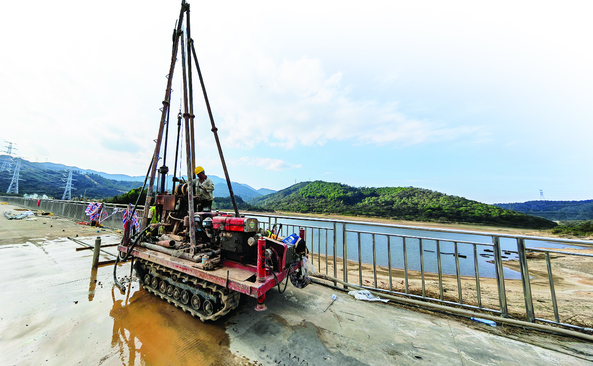 日前,記者走訪位于霞涌的魷魚灣水庫看到,原本寬闊的水面已下降許多,露出些許河床。堤壩上,工人們正操作機械進行鉆孔充填灌漿。群山環繞的魷魚灣水庫景色宜人,建成于1969年12月,原設計功能為灌溉農田,近年來增加了生產生活供水任務,目前是一座以灌溉、供水為主的綜合運用小(1)型水庫。水庫下游有霞涌、霞新、義聯、新村4個行政村。