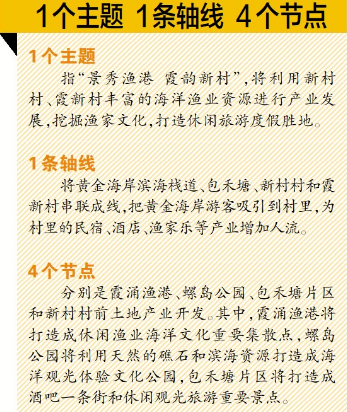 一個主題是指“景秀漁港 霞韻新村”,將利用新村村、霞新村豐富的海洋漁業資源進行產業發展,挖掘漁家文化,打造休閑旅游度假勝地;一條軸線是將黃金海岸濱海棧道、包禾塘、新村村和霞新村串聯成線,把黃金海岸游客吸引到村里,為村里的民宿、酒店、漁家樂等產業增加人流;4個節點分別是霞涌漁港、螺島公園、包禾塘片區和新村村前土地產業開發。其中,霞涌漁港將打造成休閑漁業海洋文化重要集散點,螺島公園將利用天然的礁石和濱海資源打造成海洋觀光體驗文化公園,包禾塘片區將打造成酒吧一條街和休閑觀光旅游重要景點。
