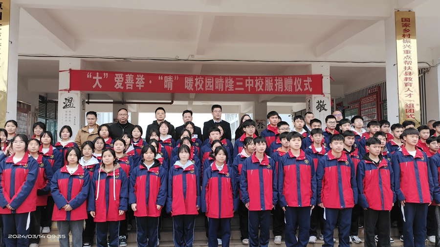 早春時(shí)節(jié),晴隆縣還比較寒冷,晴隆縣第三中學(xué)2442名學(xué)生穿上嶄新的紅藍(lán)色相間沖鋒衣,暖在身上,更暖在心上。“這份關(guān)愛和希望不僅僅是物質(zhì)上的幫助,更是一份精神上的鼓勵(lì)。我們要努力學(xué)習(xí),不僅為了自己的未來(lái),更為了建設(shè)美好的晴隆。”晴隆縣第三中學(xué)學(xué)生代表張福艷說。