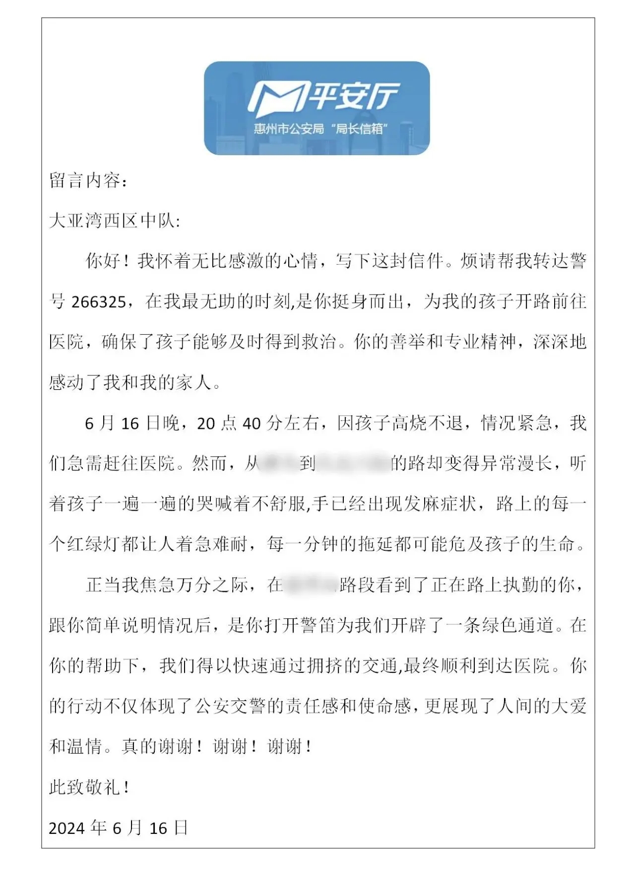 “在我最無助的時候,是你挺身而出,讓我的孩子得到了及時救助!6月16日深夜,“平安廳”信箱收到了寫給大亞灣區公安分局的一封感謝信,這封信背后的故事源自那個讓人驚心又溫馨的夜晚。
