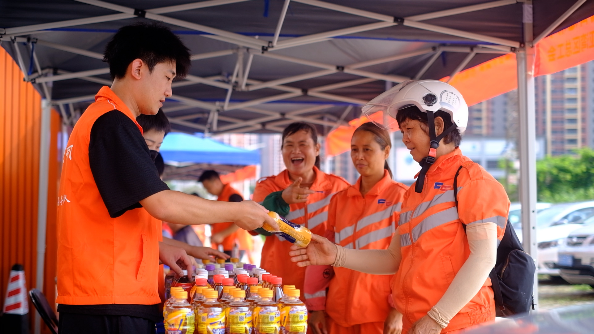 工作人員為戶外勞動者送上消暑飲品;葜萑請笥浾唿S旭新 攝