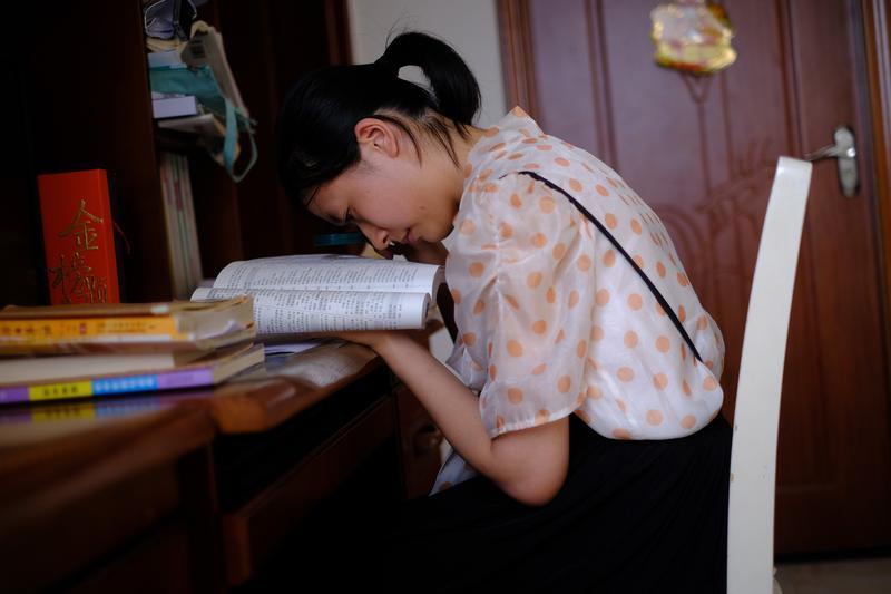 駱梓儀依靠放大鏡研究志愿填報相關書籍。