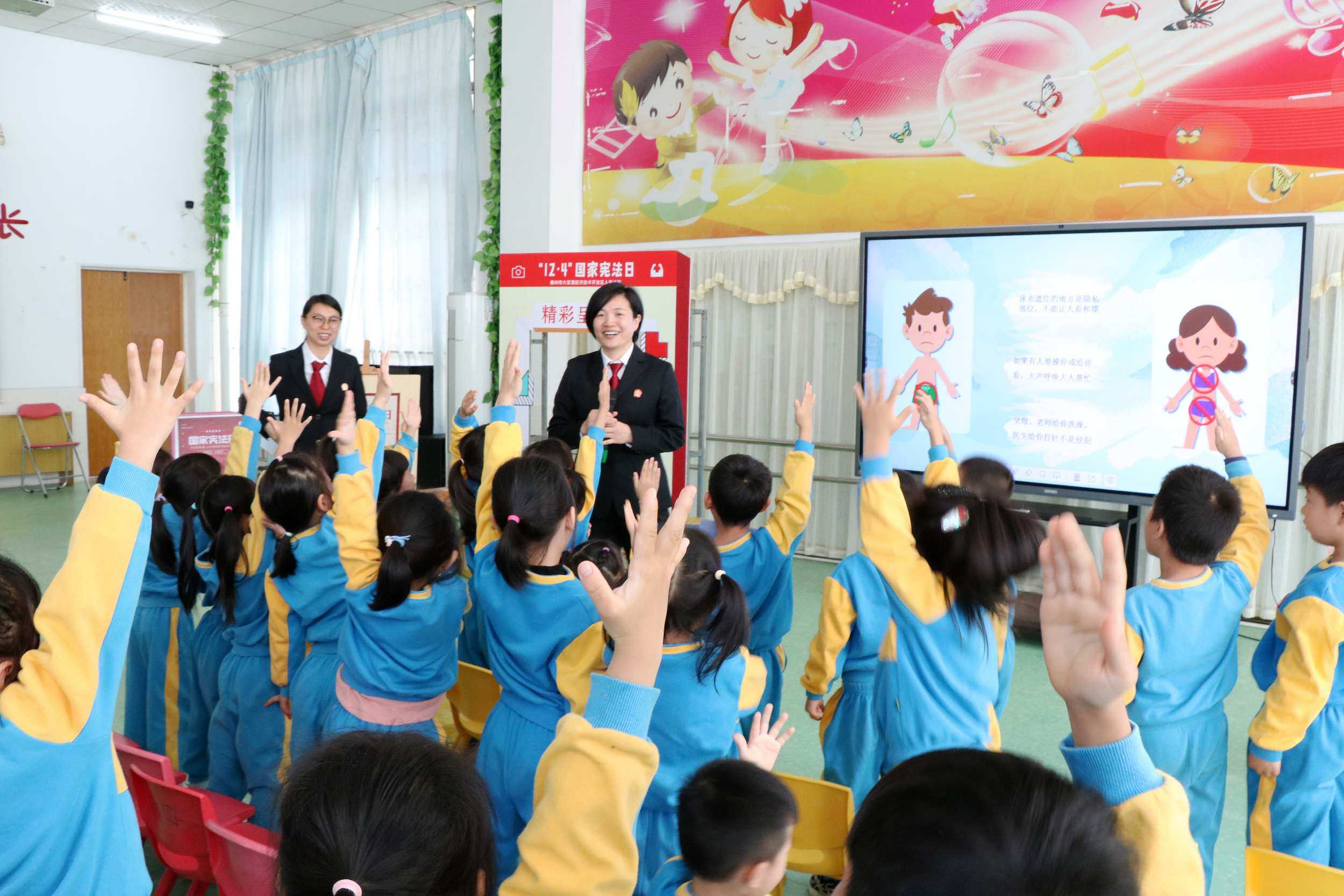 “陌生人給的糖果能不能吃?”“不能!”“如果有人要摸你的身體,應該怎么辦呢?”“大聲呼喊大人幫忙!”……童聲響亮,回蕩在課室上方,如法治音符悠遠綿長。孩子們熱情很高,舉起小手爭先恐后地回答。在一問一答趣味互動間,法治的“種子”悄然在稚嫩心靈中“生根發芽”。