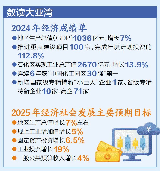 經過30多年的發展,大亞灣2024年GDP首次超過千億元,規上工業總產值達3671億元,石化區發展空間拓展一倍,新興產業園全面發力,港口蓄勢待發。會議提出,2025年經濟增長預期目標7%左右。