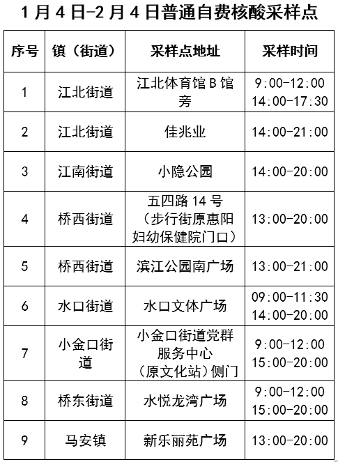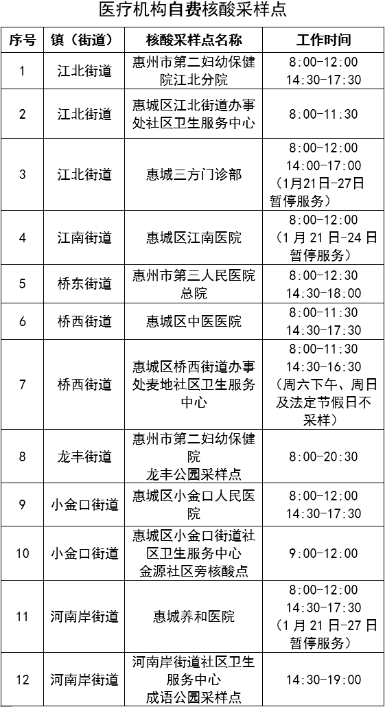 1月4日-2月4日,惠城區共設置31個自費核酸采樣點,其中普通自費核酸采樣點9個(詳見表1),醫療機構自費核酸采樣點22個(詳見表2)。