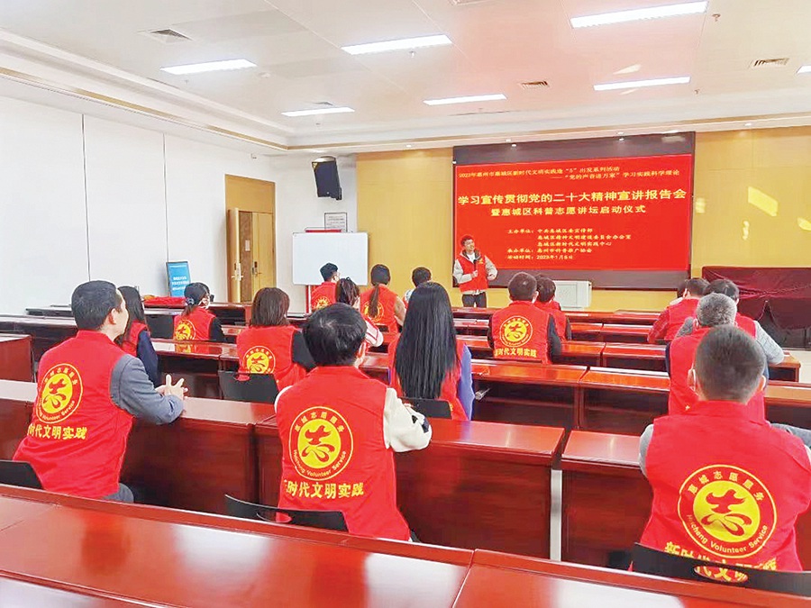 惠州日?qǐng)?bào)訊 (記者謝菁菁 通訊員周文媚)新年伊始,惠城區(qū)新時(shí)代文明實(shí)踐逢“5”再出發(fā)!根據(jù)中央、省、市文明辦的工作部署要求,1月5日,“黨的聲音進(jìn)萬家”首場(chǎng)學(xué)習(xí)實(shí)踐科學(xué)理論主題活動(dòng)——2023年學(xué)習(xí)宣傳貫徹黨的二十大精神宣講報(bào)告會(huì)暨惠城區(qū)科普志愿講壇啟動(dòng)儀式在惠城區(qū)新時(shí)代文明實(shí)踐中心舉行。市科普推廣協(xié)會(huì)志愿者代表一起聆聽“科教資源進(jìn)鄉(xiāng)村,共筑鄉(xiāng)村教育夢(mèng)”科普講座。