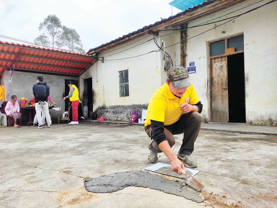 志愿者自帶水泥和沙子幫劉新玉將房子里外的坑洼填平。
