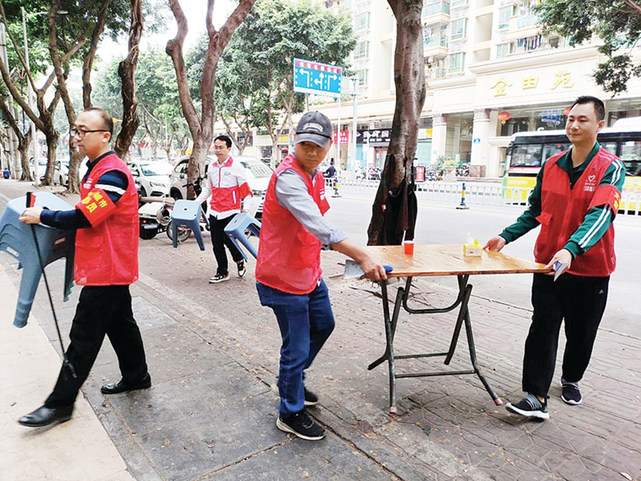 文明城市督導員協助商戶整理占道物品。 惠州日報記者謝菁菁 通訊員李曉雪 攝